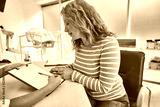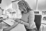 This is important. Side view portrait of mature woman sitting at the table while gynecologist with pen in hand pointing at medical form