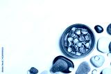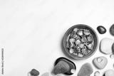 Flat lay composition with spa stones and space for text on white background