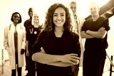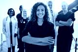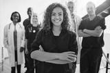 Smiling female doctor standing with medical staff in a hospital