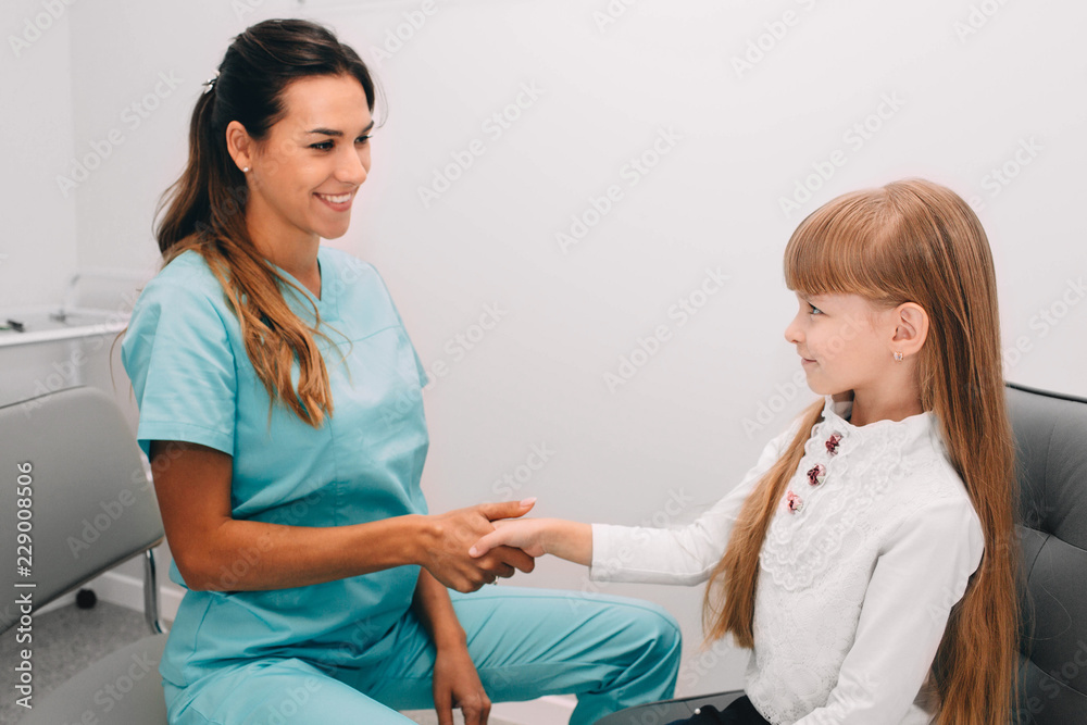 Handshake with little patient, at medical office. Consultation and reception of the children's doctor