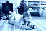 Child is using mobile phone under Christmas tree at home. Kid is playing in children games, looking at devices. Girl in blue knitted sweater with her present or gift is laying on warm floor.