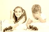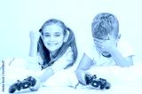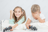 Siblings playing video game in the living room, sad boy lose, girl won and rejoiced