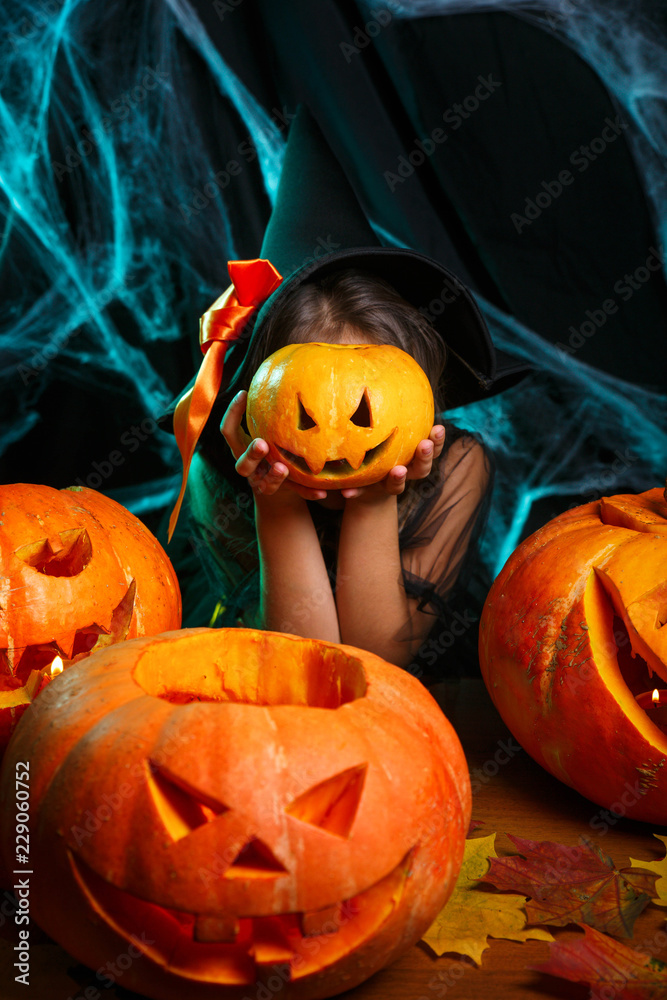 Happy halloween. Pretty little child girl in witch costume with carving pumpkin . Happy family preparing for Halloween.