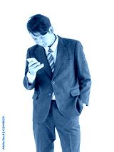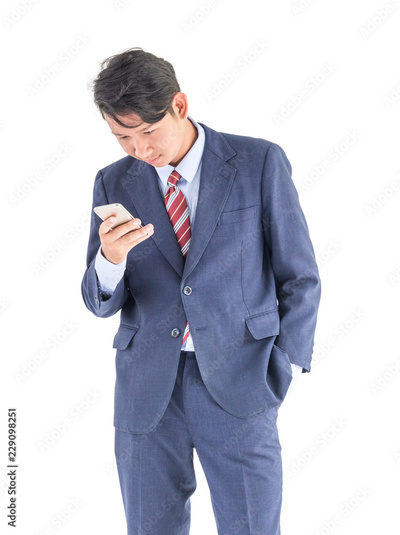 Business men portrait holding phone isolated on white