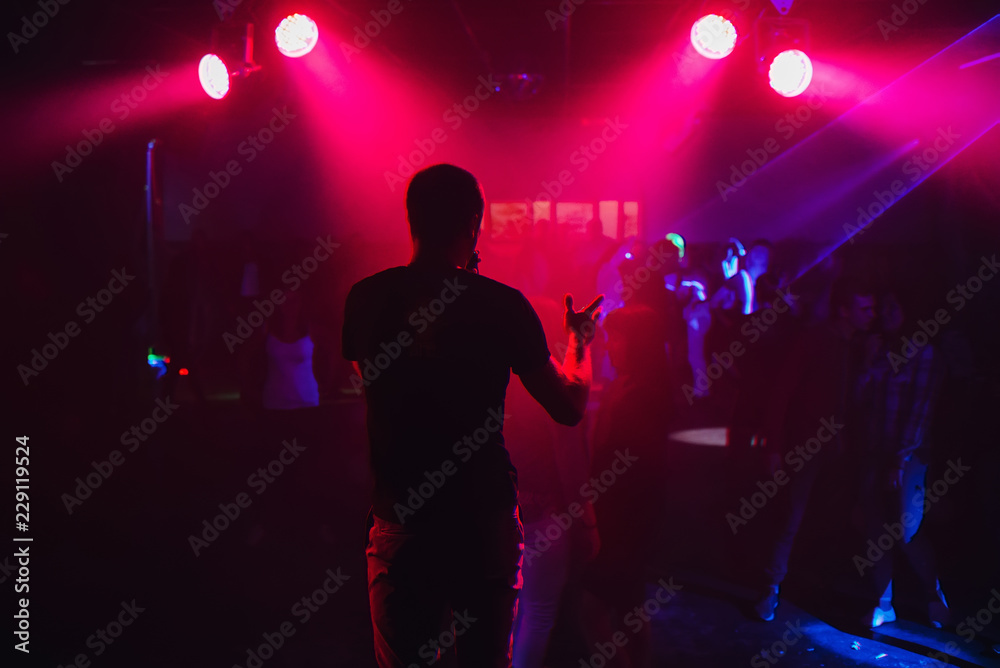 mc with microphone on the night club scene on the background of blurred dancing people