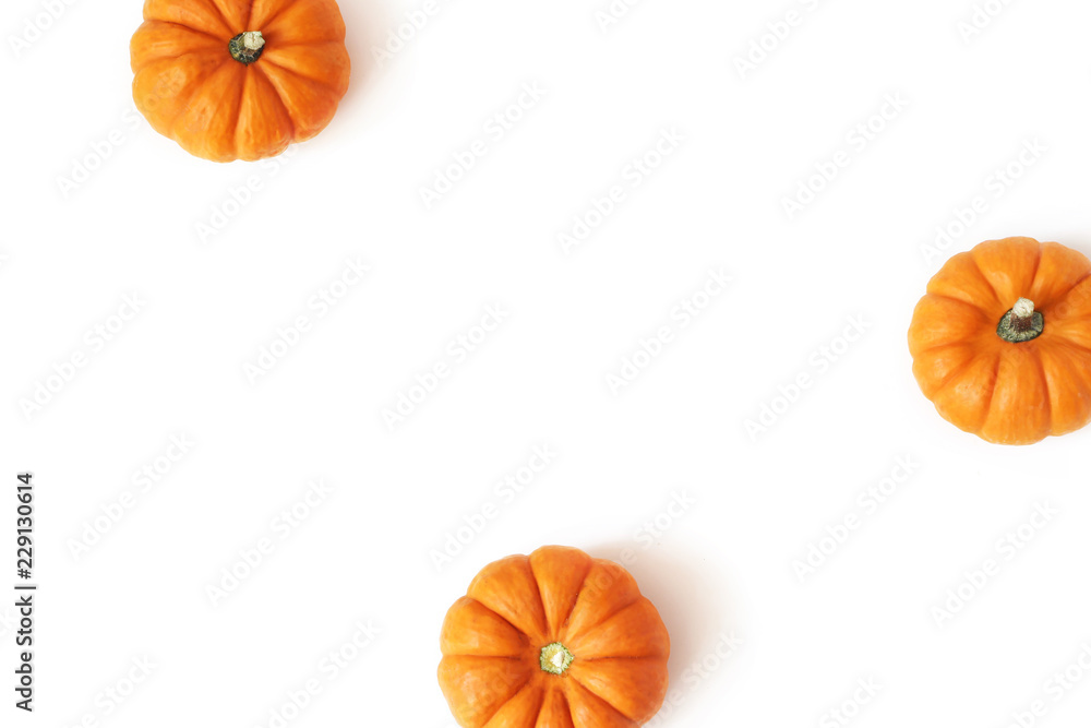 Autumn frame made of little orange pumpkins isolated on white table background. Fall, Halloween and Thanksgiving concept. Styled stock flat lay photography. Top view. Empty space for text. Vegetable.