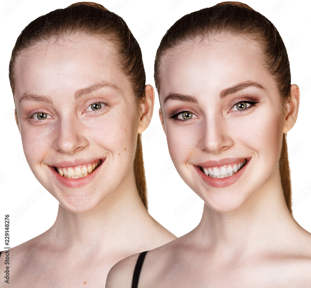 Comparison portrait of young woman before and after makeup.