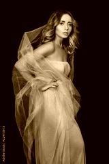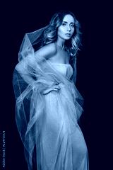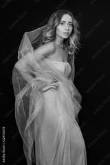 Naked woman art in lilac light transparent dress posing on a dark background. Woman wrapped in purple fabric, beautiful slim figure, purity and integrity. Luxurious Nude naked woman