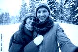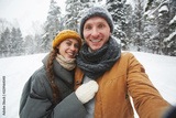 Selfie of happy beautiful young couple in winter park: smiling optimistic couple of hikers in winter coats posing for photo, pretty girl hugging boyfriend