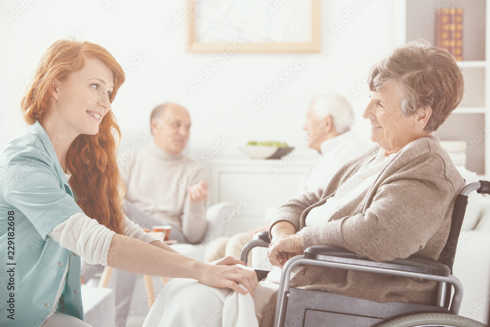 Young nurse supporting an elderly woman on wheelchair. Nursing home concept