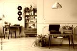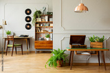 Chandelier above vintage gramophone and box with green plants in vintage home office interior