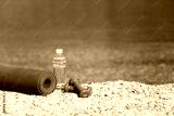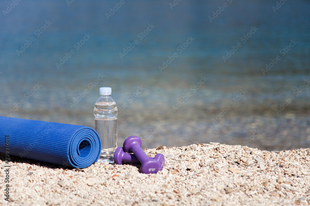 Fitness equipment on sea beach. Sport class in resort. Bottle of clean drinking water, two purple female dumbbells and yoga mat at blue ocean background. Concept of healthy lifestyle and traveling.