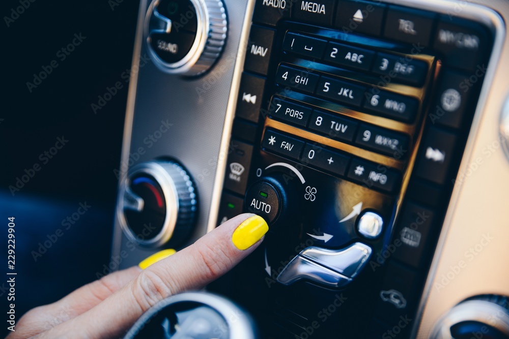 Woman turning on auto mode on car automatic air conditioner