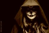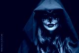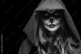 Beautiful woman with Halloween sugar skull face art, makeup, wearing wearing red cape, hood, looking at camera. Close up studio portrait. Dark, black background. Copy, empty space for text