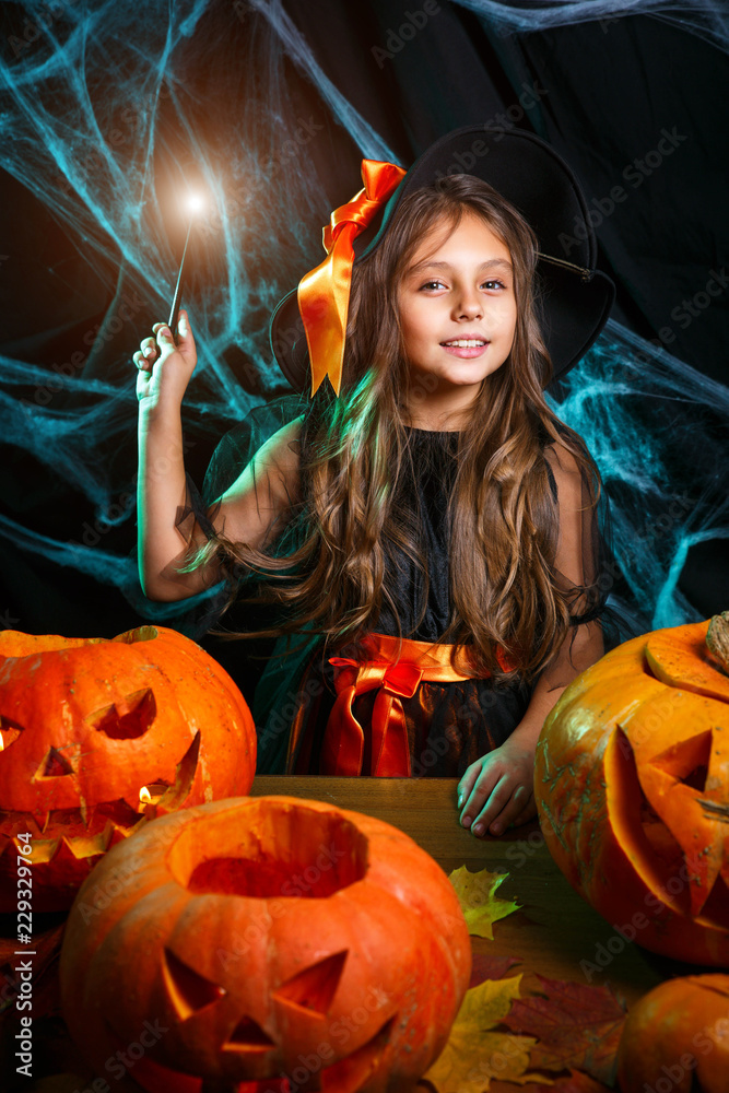 Halloween concept - little witch child enjoy playing with magic wand over spider web and with curved pumpkins background.