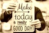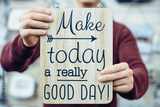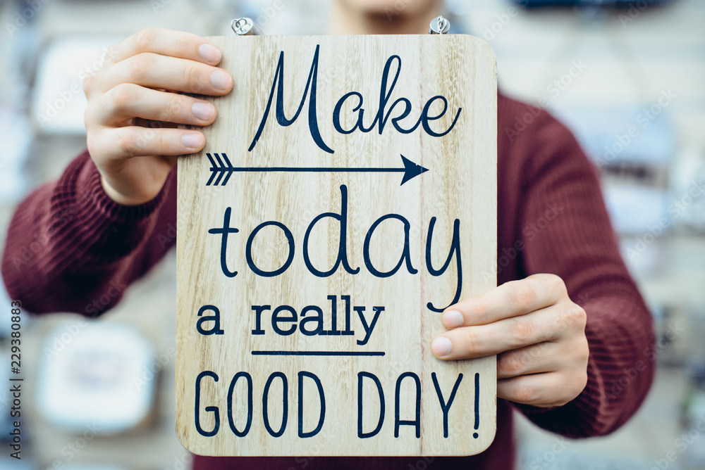 Caucasian man's hands holding motivational message typing on the wooden board. Everyday Inspirational quotes concept. Vintage styled toning. Close up, Selective focus.