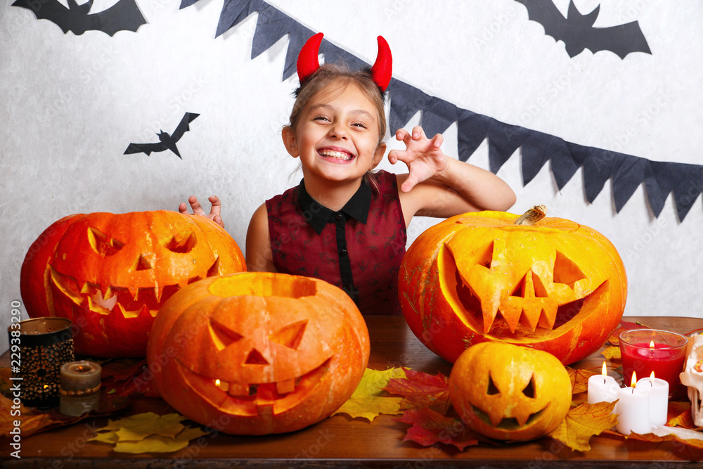 Happy halloween. Funny little child girl with carving pumpkin. Happy family preparing for Halloween.