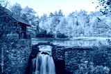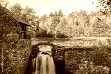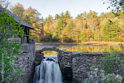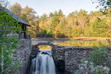 Stone wall and building with waterfall and Autumn trees reflected on Lake in upstate New York.