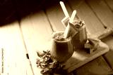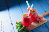 Tasty cold watermelon smoothie drink with mint in glasses, summer refreshing cocktail on wooden background