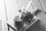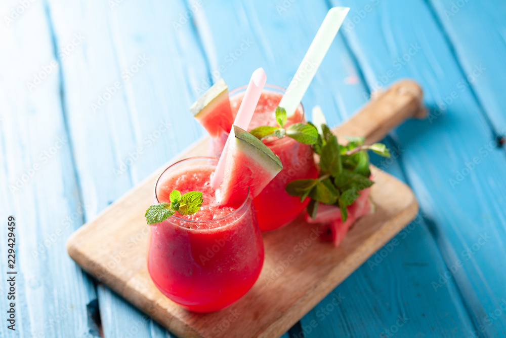 Tasty cold watermelon smoothie drink with mint in glasses, summer refreshing cocktail on wooden background