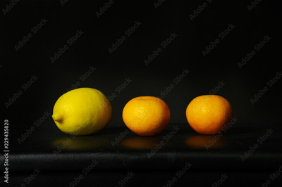 one yellow lemon and two orange fruit for health food in vintage still life style with black background