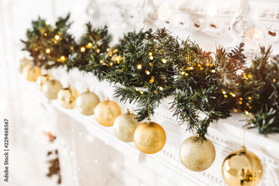 Christmas tree background and Christmas decorations, blurred, sparking, glowing. Happy New Year and Xmas theme.
