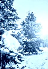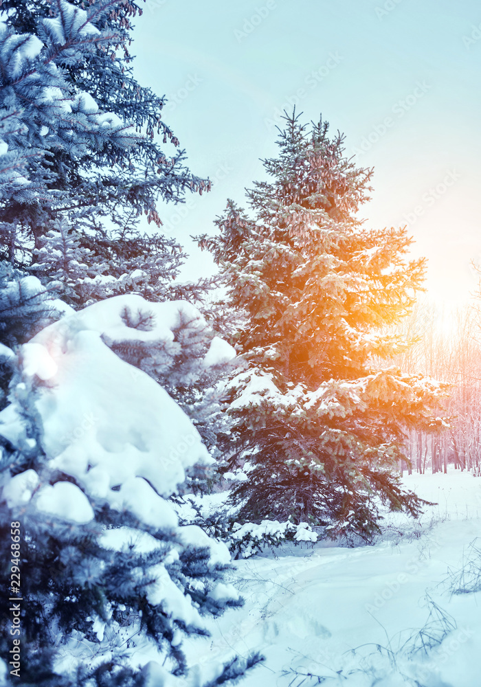 Frosty winter landscape in snowy forest. Pine branches covered with snow in winter weather. Christmas background with fir trees