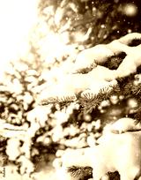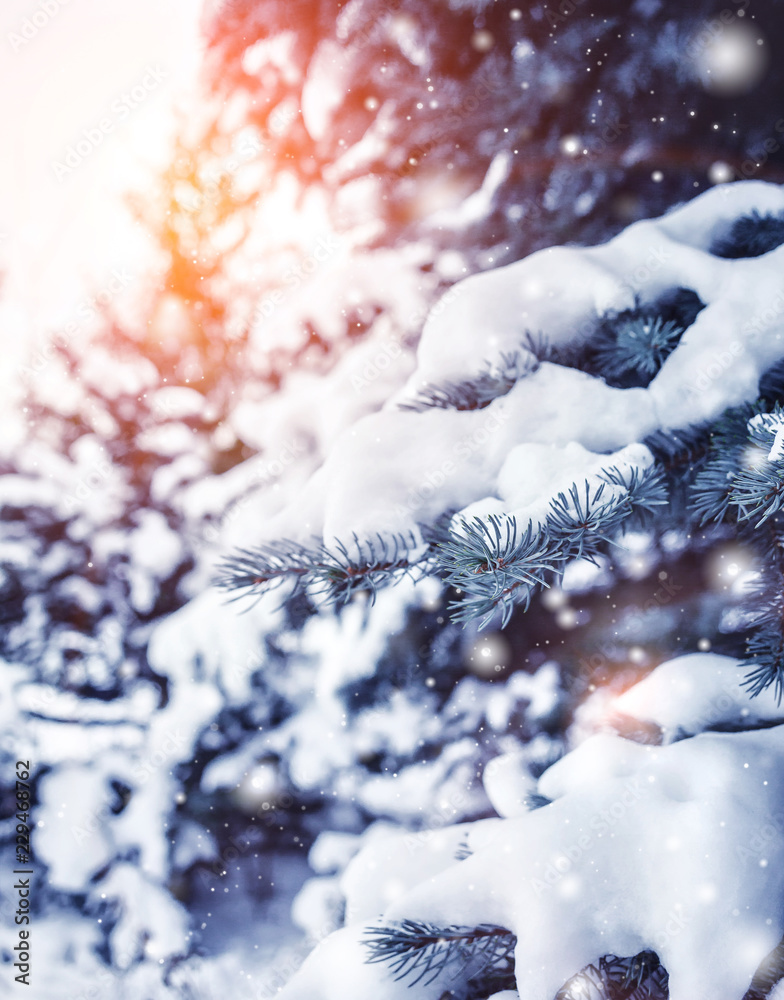 Frosty winter landscape in snowy forest. Pine branches covered with snow in winter weather. Christmas background with fir trees