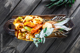Fruit salad with banana, kiwi, orange, grapefruit in pineapple on dark background. Healthy breakfast