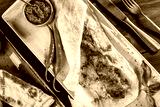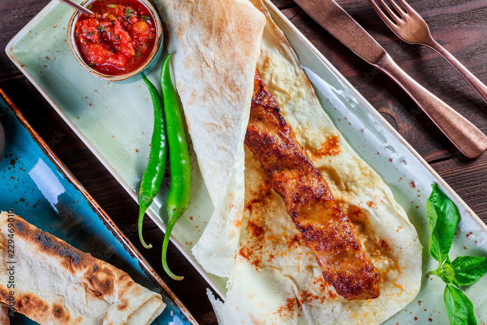 Chicken kebab with pita bread, tomato sauce and cognac on wooden background. Hot Meat Dishes. Top view