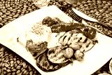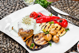 Grilled meat steak veal medallion with cheese sauce and baked vegetables on plate. Healthy food. Hot Meat Dishes
