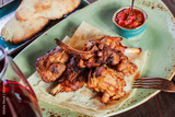 Roasted rabbit with herbs, tomato sauce and glass of wine on a plate. Hot Meat Dishes