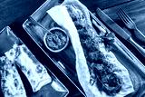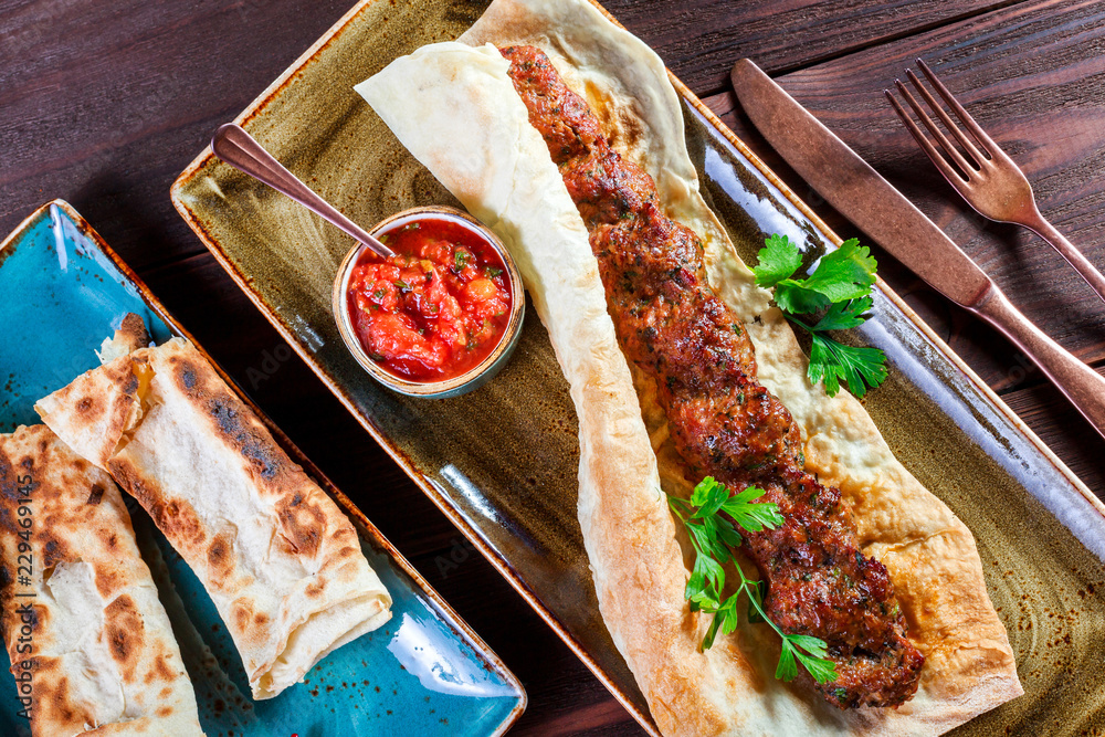 Beef kebab with pita bread, tomato sauce and vegetables on wooden background. Hot Meat Dishes