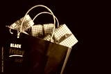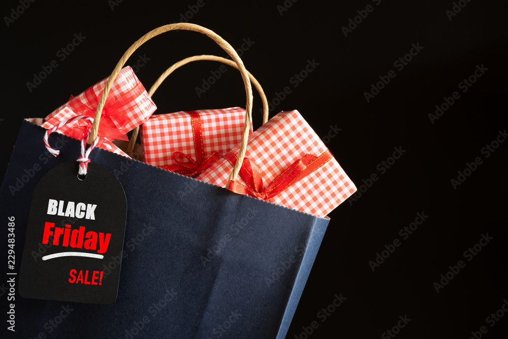 Black Friday Sale shopping bag and gifts boxes with message tag. shopping concept.
