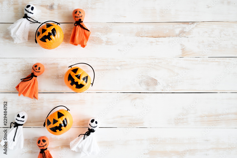 Top view of white ghost and yellow pumpkins with jelly worm on white wooden background. halloween concept.
