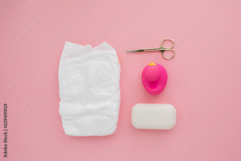 Set for a newborn diaper scissors, toy duck, soap bar, pink background top view