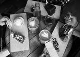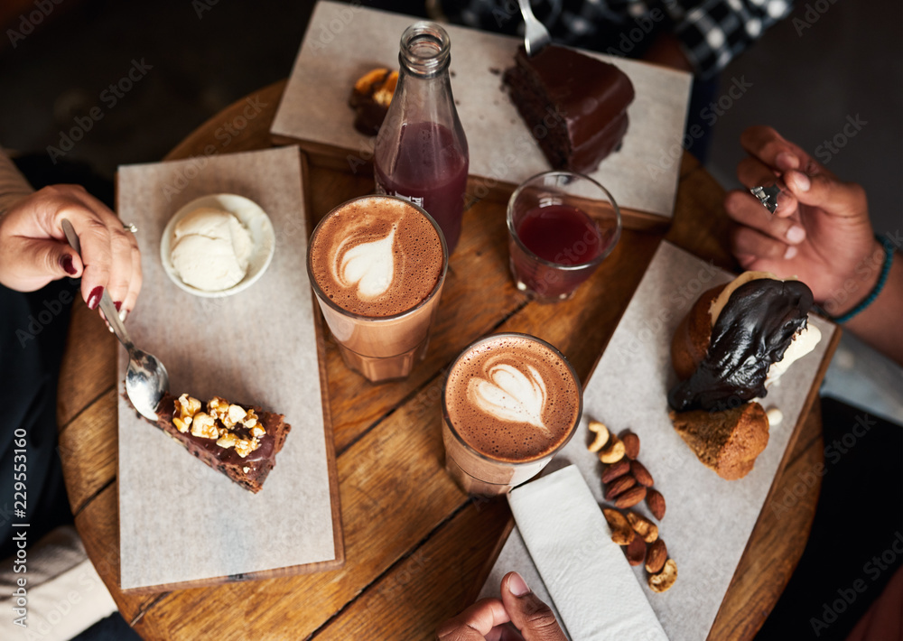 Friends eating desserts and drinking coffee together in a cafe