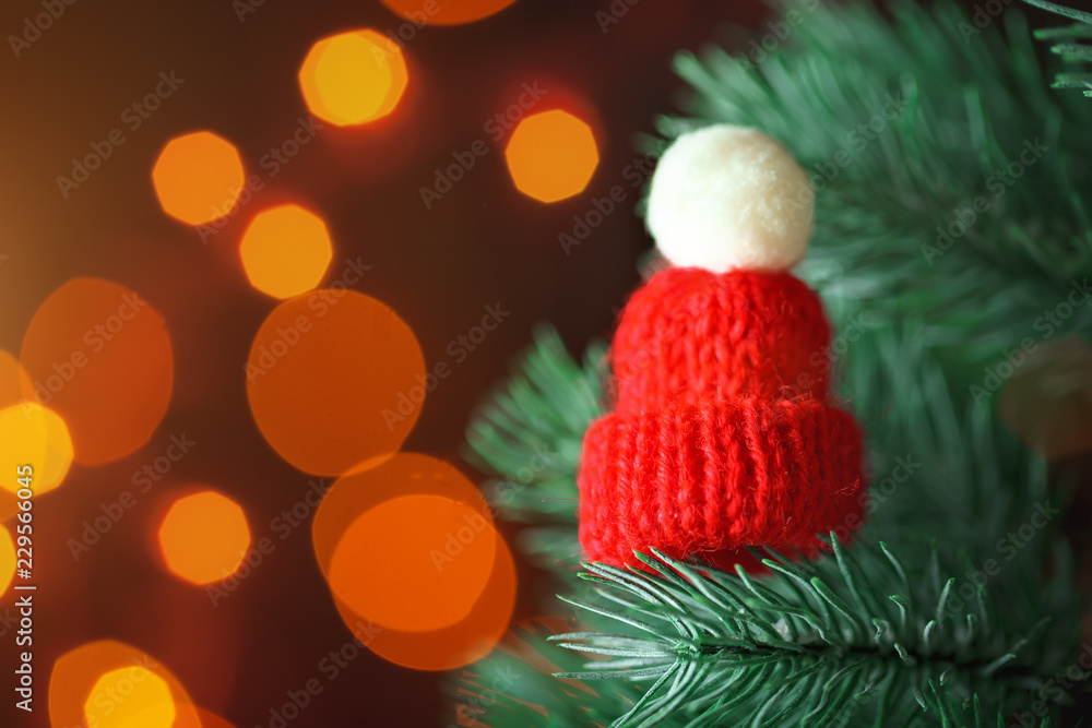 Merry Christmas and happy New year. Little knitted hat on the Christmas tree. Background with copy space.