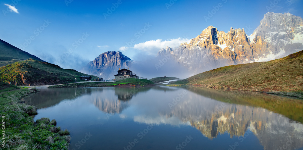 Riflesso delle Pale di San Martino con la Baita Segantini