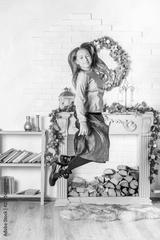 Stylish teenager jumps in a skirt. Concept of Merry Christmas, New Year, family, holidays