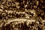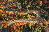 Winding mountain road trough the forest in the autumn with cars passing on the road