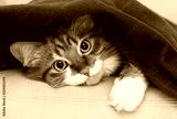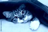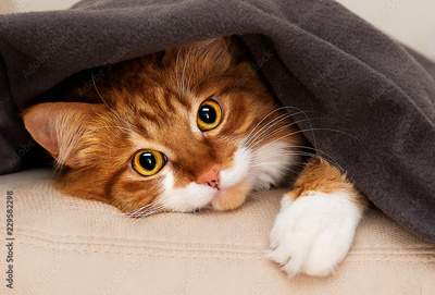 cat peeking under blanket