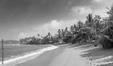 Paradise Mirissa beach in Sri Lanka. Yellow sand and palm trees with blue sky and Flag of Sri Lanka