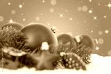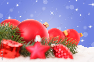 Weihnachten rote Weihnachtskugeln Weihnachtsdeko Weihnachtsdekoration Sterne Dekoration Schnee Textfreiraum Copyspace