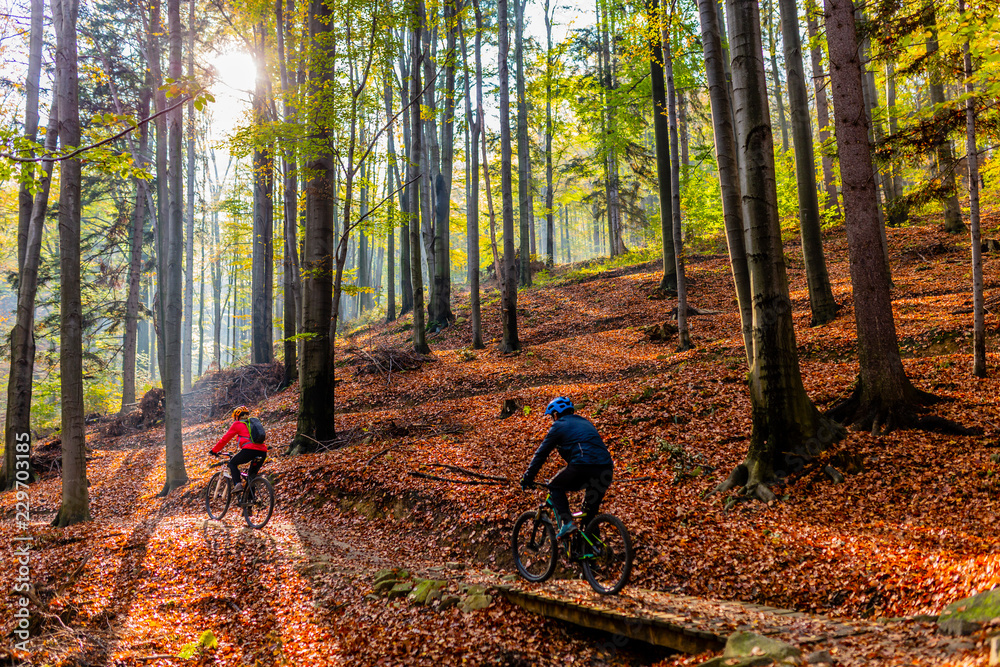 Cycling, mountain biker couple on cycle trail in autumn forest. Mountain biking in autumn landscape forest. Man and woman cycling MTB flow uphill trail.