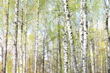 Young birch with black and white birch bark in spring in birch grove against the background of other birches