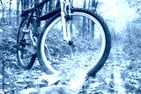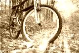 Mountain biking in autumn forest on background of beautiful yellow sunset among yellow autumn trees and yellow autumn leaves