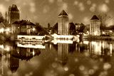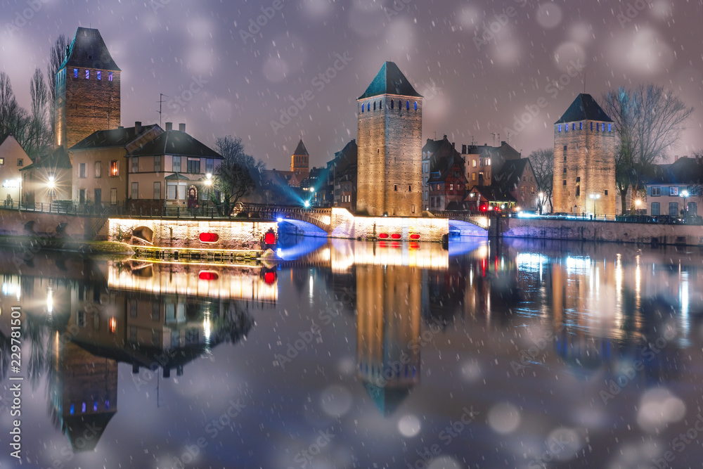 Medieval towers and bridges with mirror reflections in Petite France in the snowy night, Strasbourg, Alsace, France