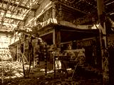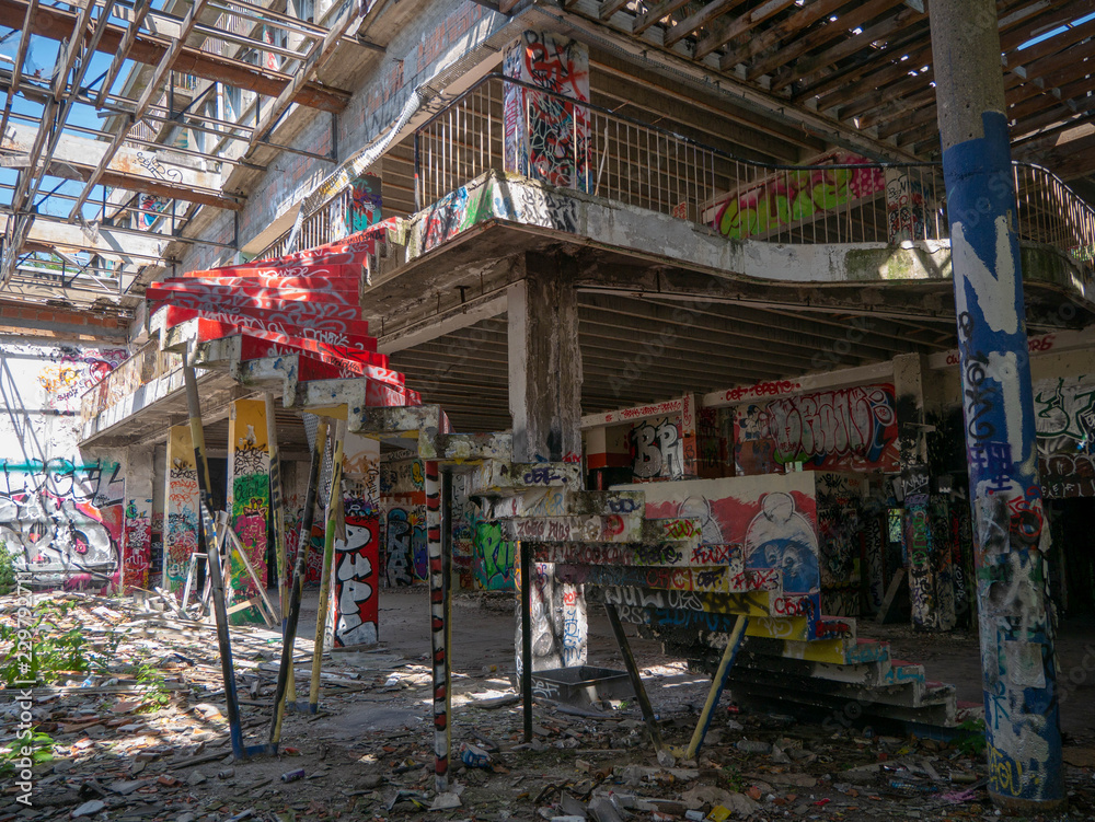 Stairs leading up to another floor in an old abandoned building or factory, completely destroyed and vandalized, painted with colourful graffiti street art