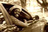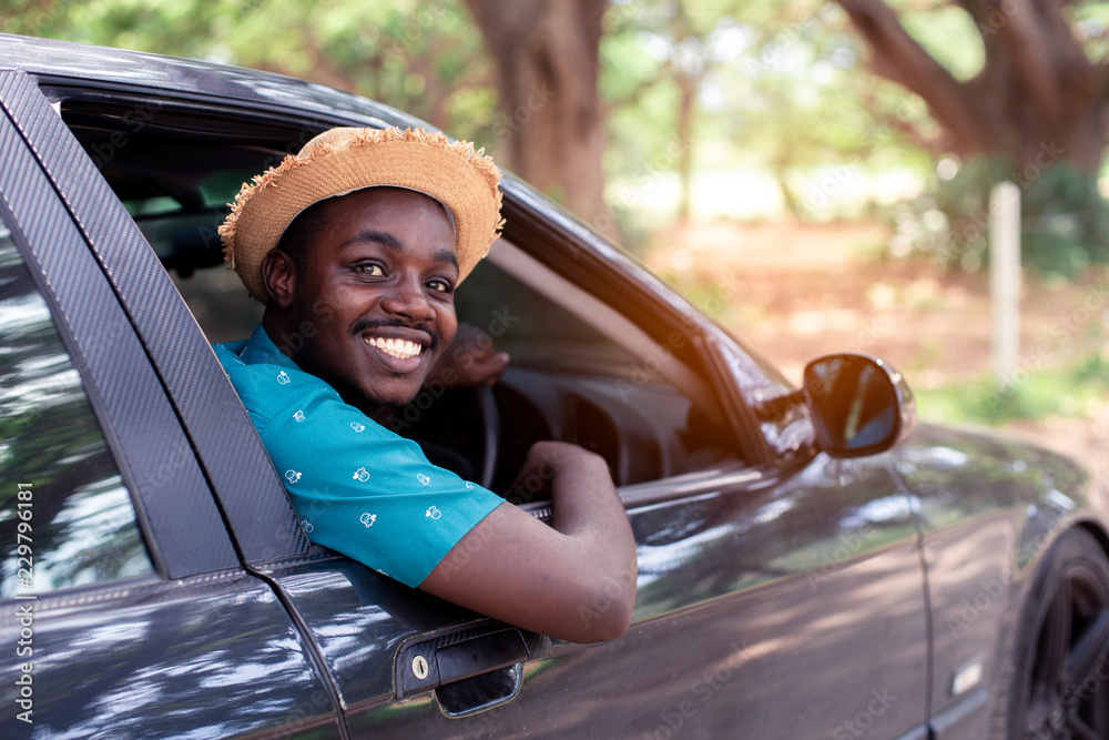 African man driver Wearing sunglasses and smiling while sitting in a car with open front window.